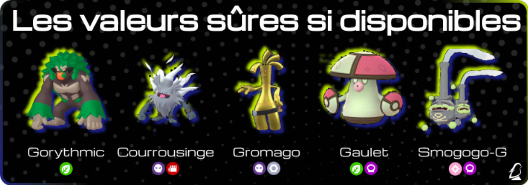 Gorythmic était tellement puissant en 8g qu’il a dû être nerf. Ça pose le décor ! En arrivant sur le terrain, il pose le Champ Herbu. Ce terrain rend prioritaire sa capacité Gliss’Herbe. Gorythmic a également accès à Bluff, Demi-Tour, Sabotage et Provoc. C’est un excellent pivot qui synergise parfaitement avec Félinferno. Son potentiel offensif n’est pas à négliger non plus. Martobois sous le Champ Herbu peut prendre le K.O sur de nombreux Pokémon. En couverture, Cavalerie Lourde punit les types Acier et Feu. L’objet le plus utiliser sur Gorythmic est la Veste de Combat. Fort dans toutes les régulations jusqu’à présent, Gorythmic change très peu de set. S’il est disponible dès le début de Champions, investissez sur lui car vous saurez qu’il vous suivra tout au long du jeu.