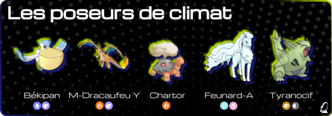 Les climats sont une dimension importante de Pokémon. En format doubles, leur efficacité est décuplée puisqu’on peu avoir sur le même tour la pose du climat et l’attaque du Pokémon qui en profite. Cette section s’adresse donc à celles et ceux qui veulent jouer un climat au début de Champions. Et ce n’est pas un mauvais choix ! Les climats sont des stratégies faciles à prendre en main et souvent économiques car elles demandent peu d’adaptation. En revanche, elles sont très dépendantes du match-up. Certains Pokémon contrent totalement un climat, certains climats ont l’avantage sur d’autres. Il faudra donc accepter de perdre des matchs. Pour un joueur free-to-play, les équipes climat sont peut-être le meilleur choix pour le début de jeu.