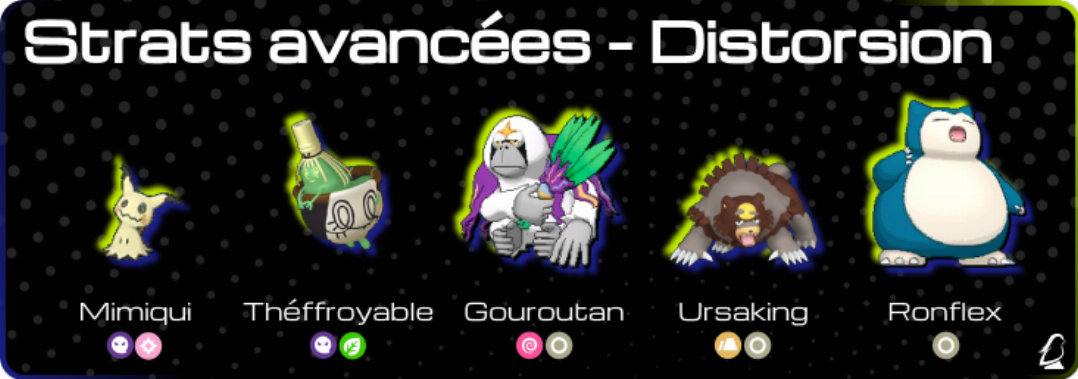 Distorsion est une attaque de statut inversant les rapports de vitesse. Pendant 5 tours à compter du tour où elle est posée, les Pokémons les plus lents deviendront les plus rapides et inversement. Cette mécanique fait parti du « speed control » où l’on prend l’avantage sur l’adversaire en faisant agir ses Pokémons en premier, en profitant ici de Pokémons lents. L’avantage est de ne pas à avoir à investir de points en vitesse et ainsi profiter de meilleures statistiques offensives et en bulk. On distingue deux types d’équipes ; celles possédants un mode distorsion qui peuvent profiter de Pokémons plus lents en fonction de l’équipe adverse ou du déroulement du match mais aussi d’un mode rapide (parfois avec Vent Arrière), et les équipes « Hard Disto » dont le plan de jeu repose toujours sur la pose de Distorsion quitte à sacrifier un Pokémon pour pouvoir la poser.