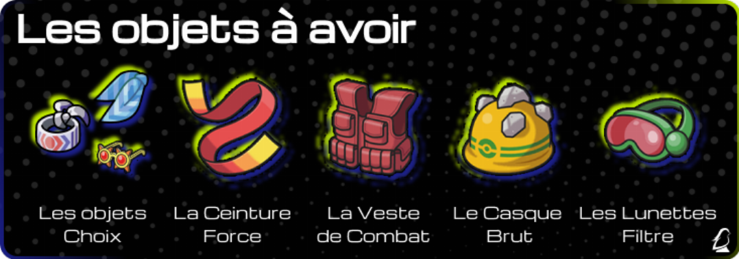 Les objets sont un apport décisif pour les Pokémons. Chacun peut en tenir un. Cependant, deux Pokémon d’une même équipe ne peuvent pas tenir le même objet. Ils permettent de contrer une de leur faiblesse ou d’améliorer un de leur point fort.